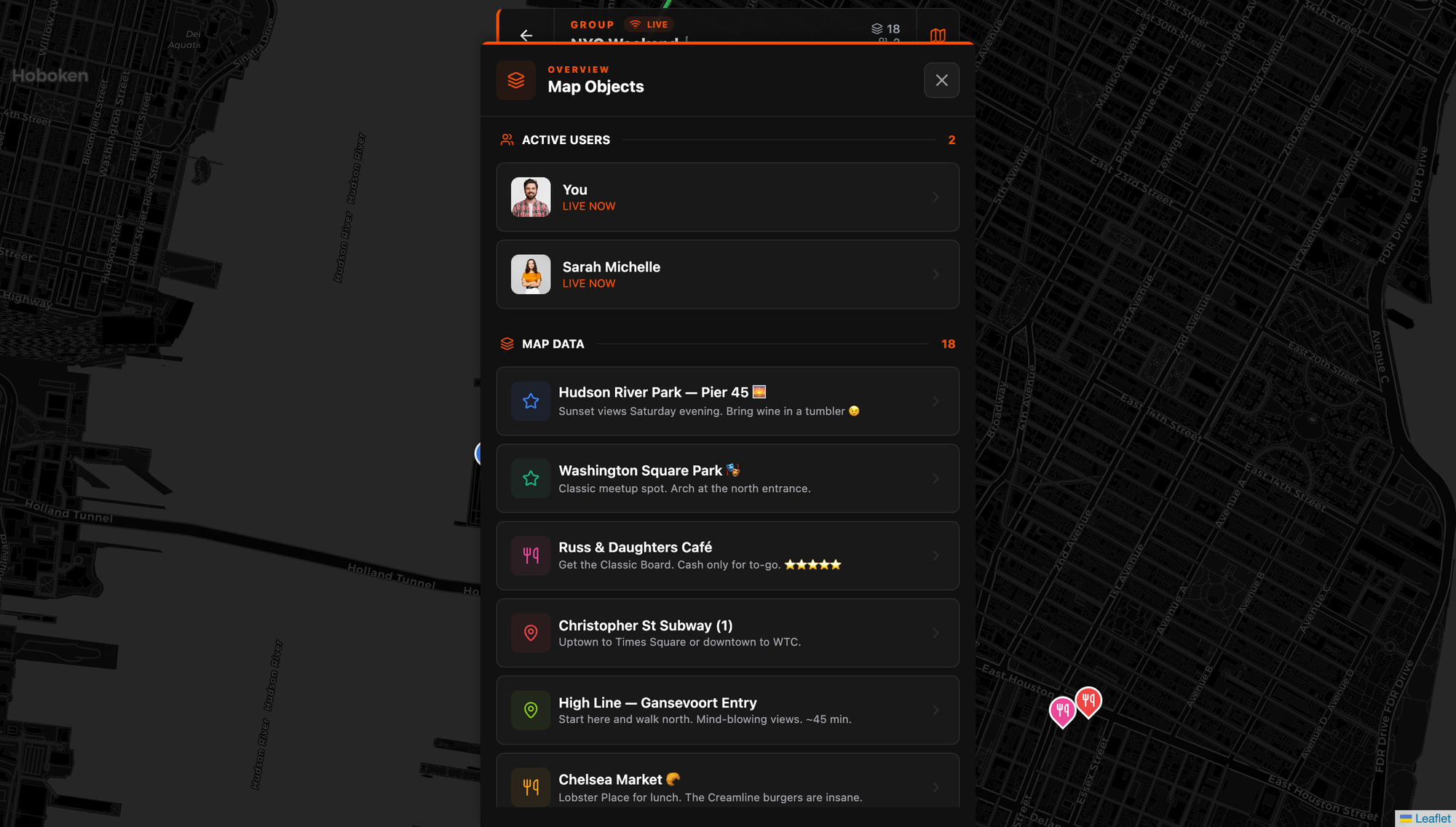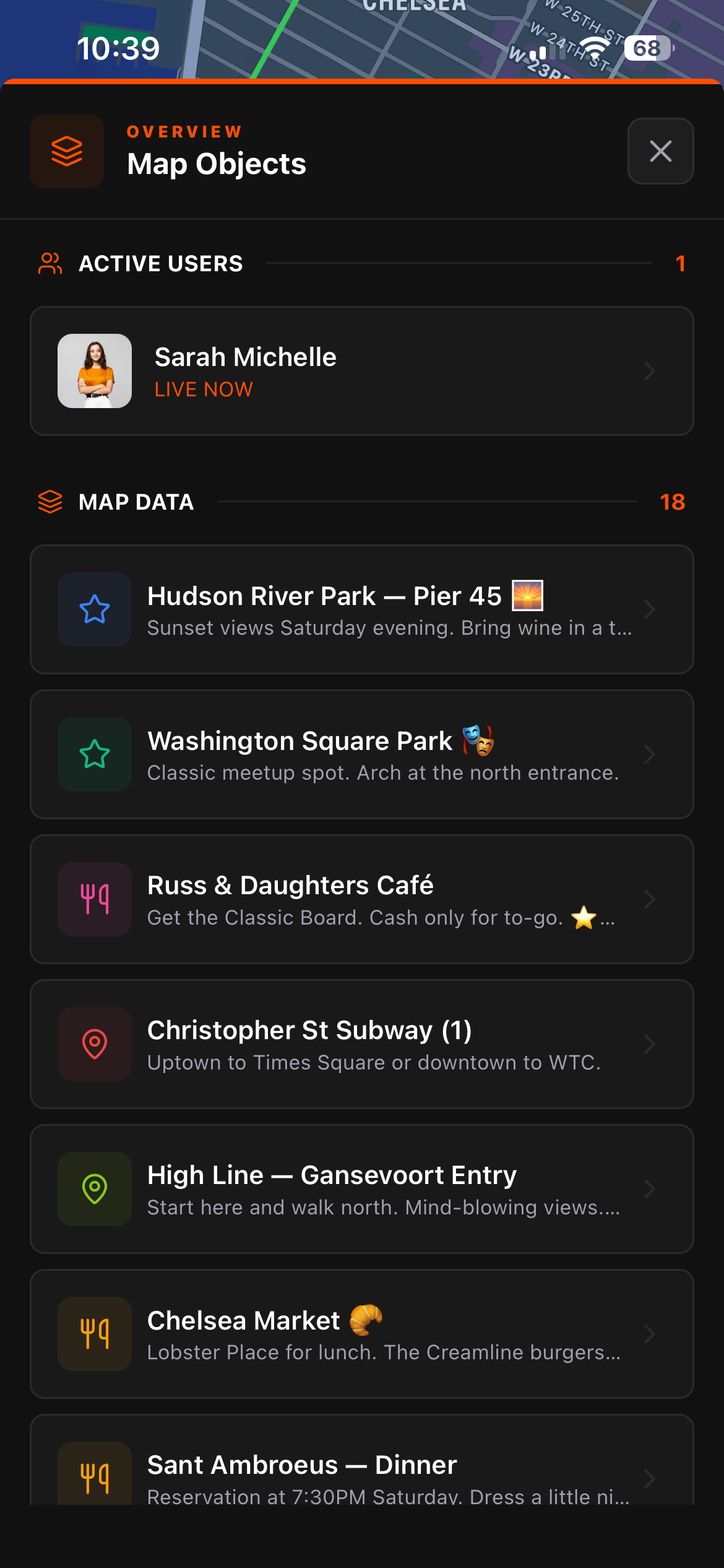 LIST — Organized overview of every map object and active user in the group. Pins, routes, areas sorted by creation time. Active members show as LIVE NOW. On the web client this shows as "Map Objects" and it's the fastest way to get a full picture of the group's situation without panning around the map.