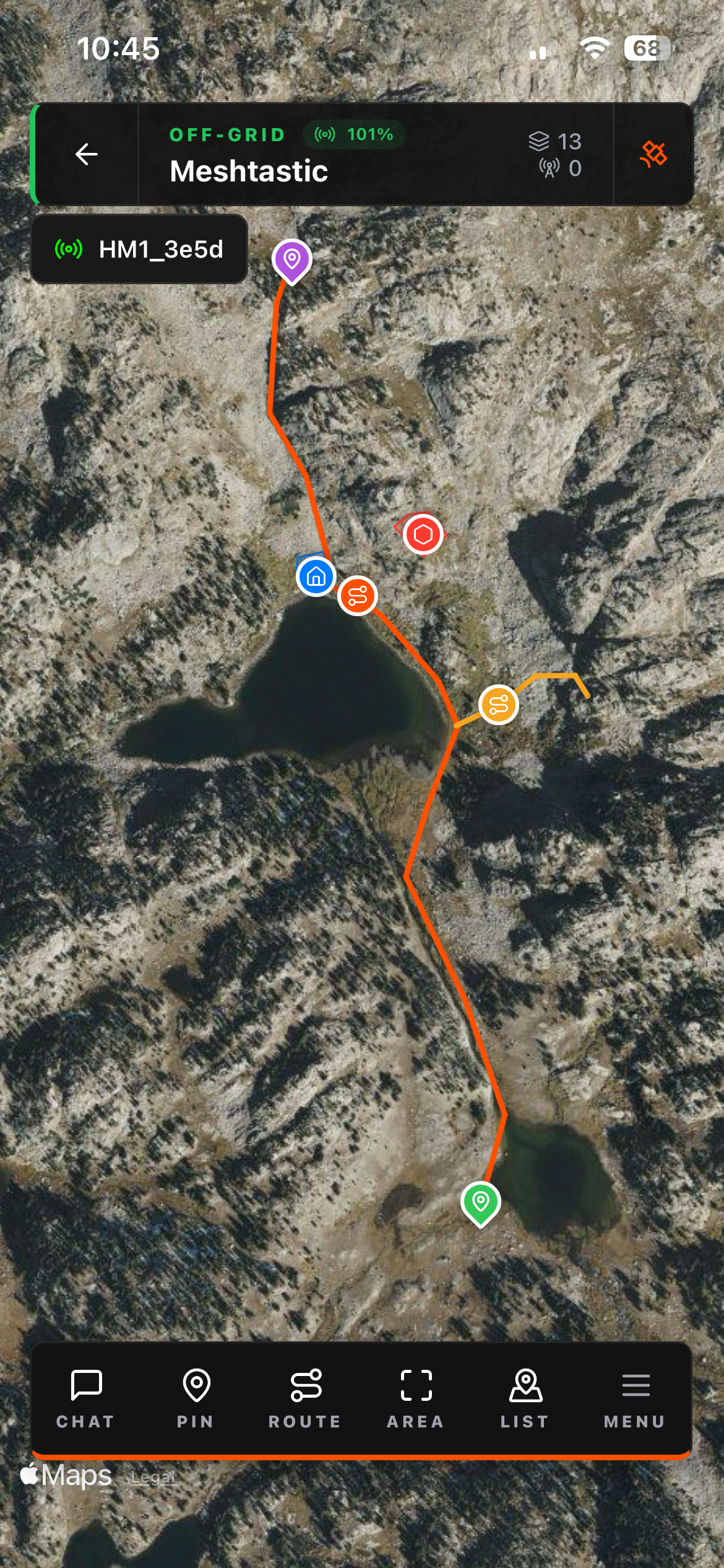 PIN — Drop a point anywhere on the map. Name it, add a description. Immediately visible to everyone in the group. Meetup spots, hazards, water sources, staging areas, parking — anything worth marking.