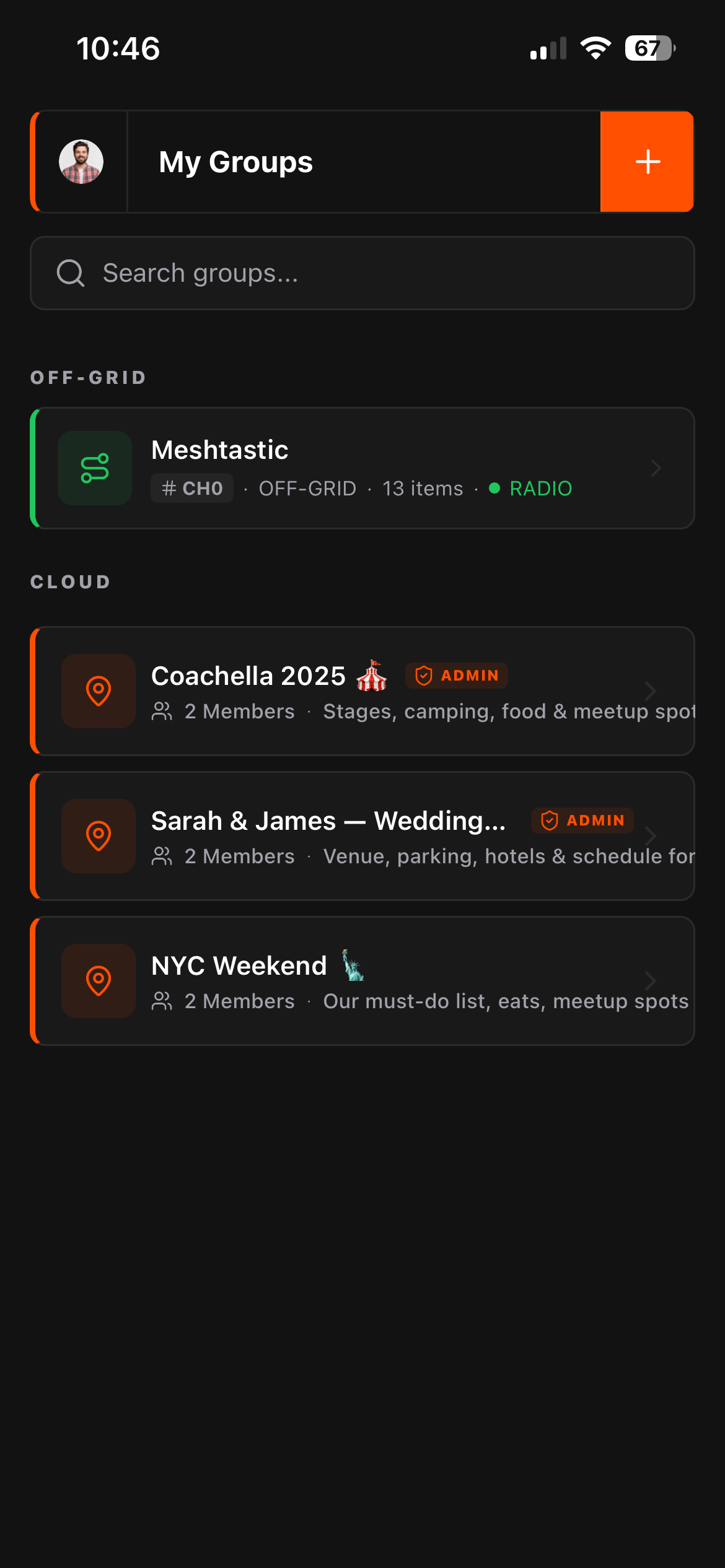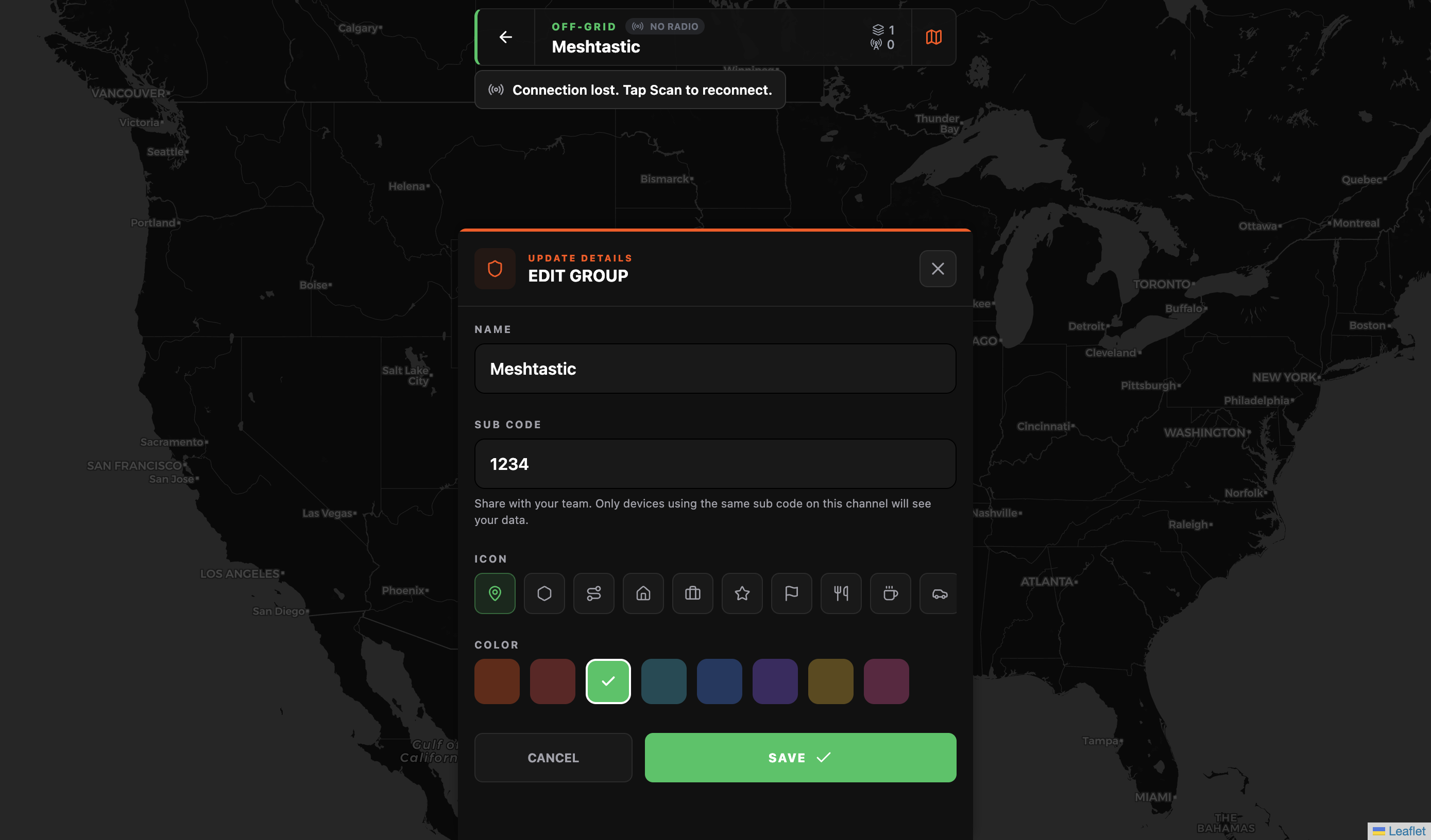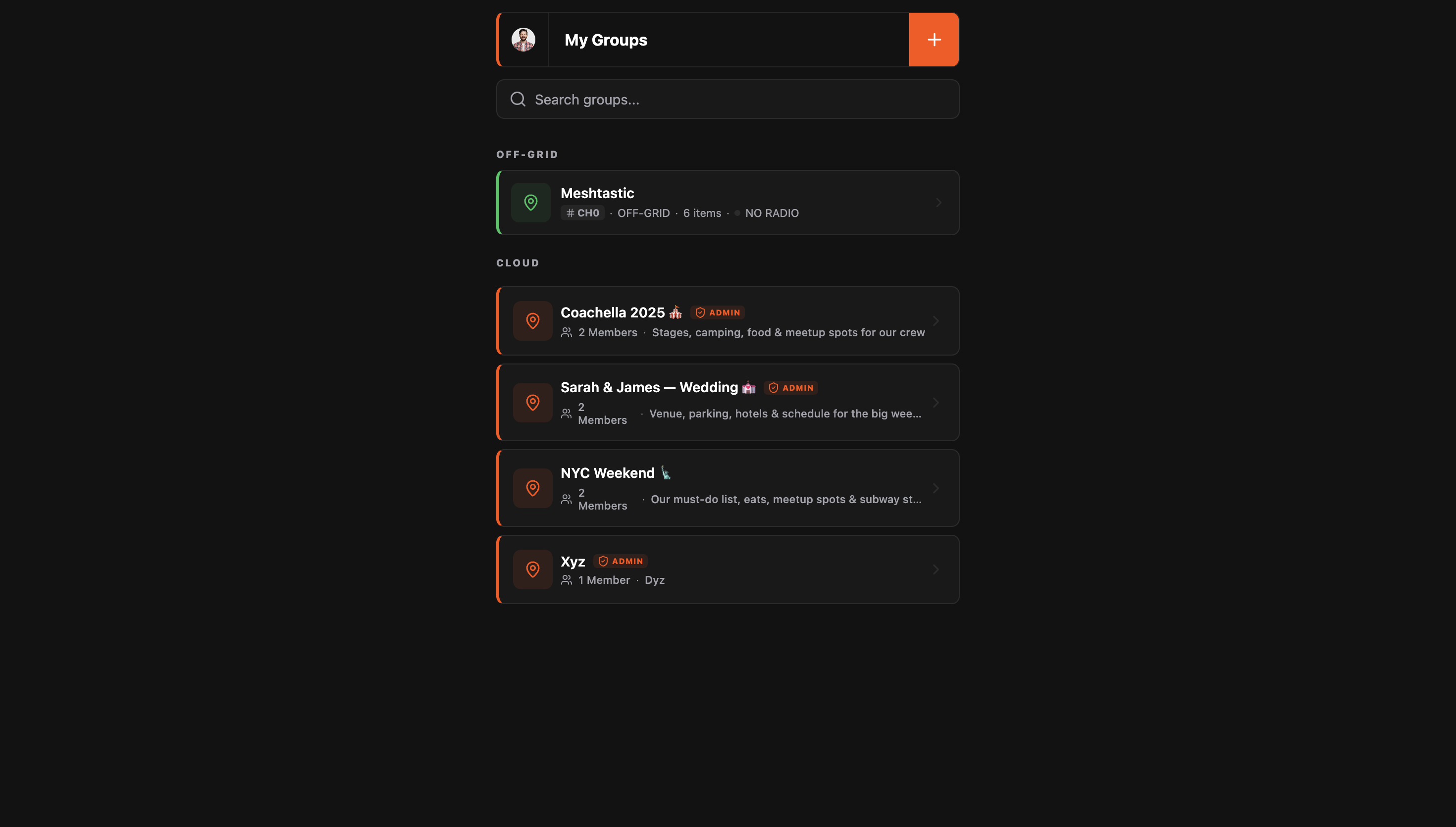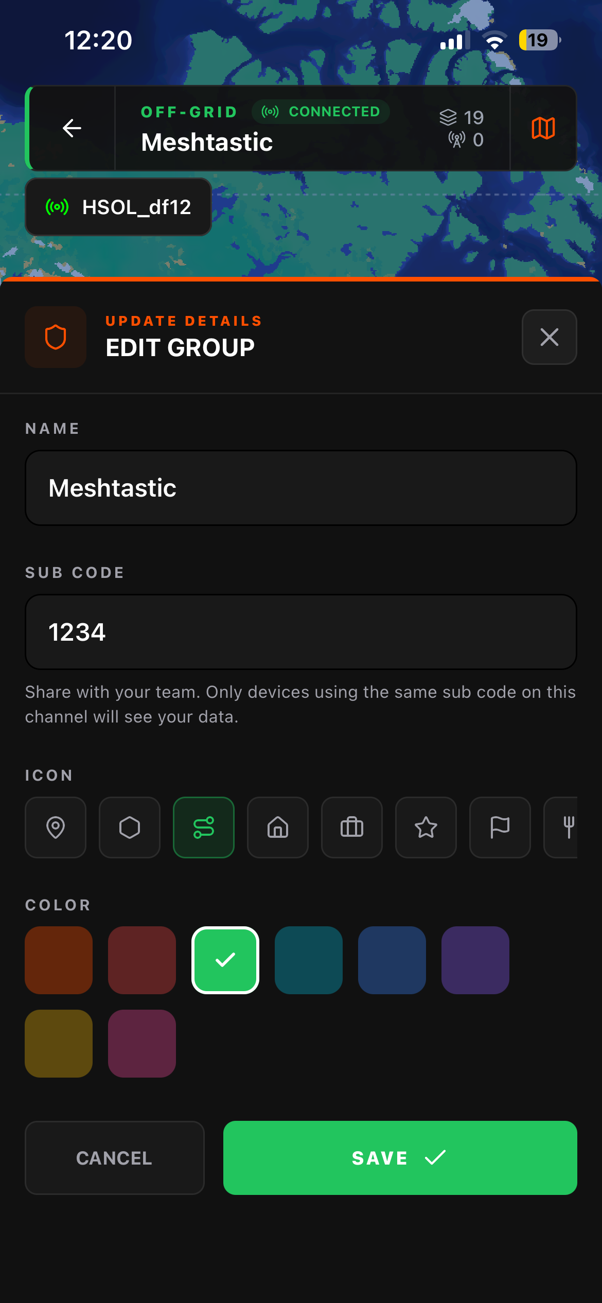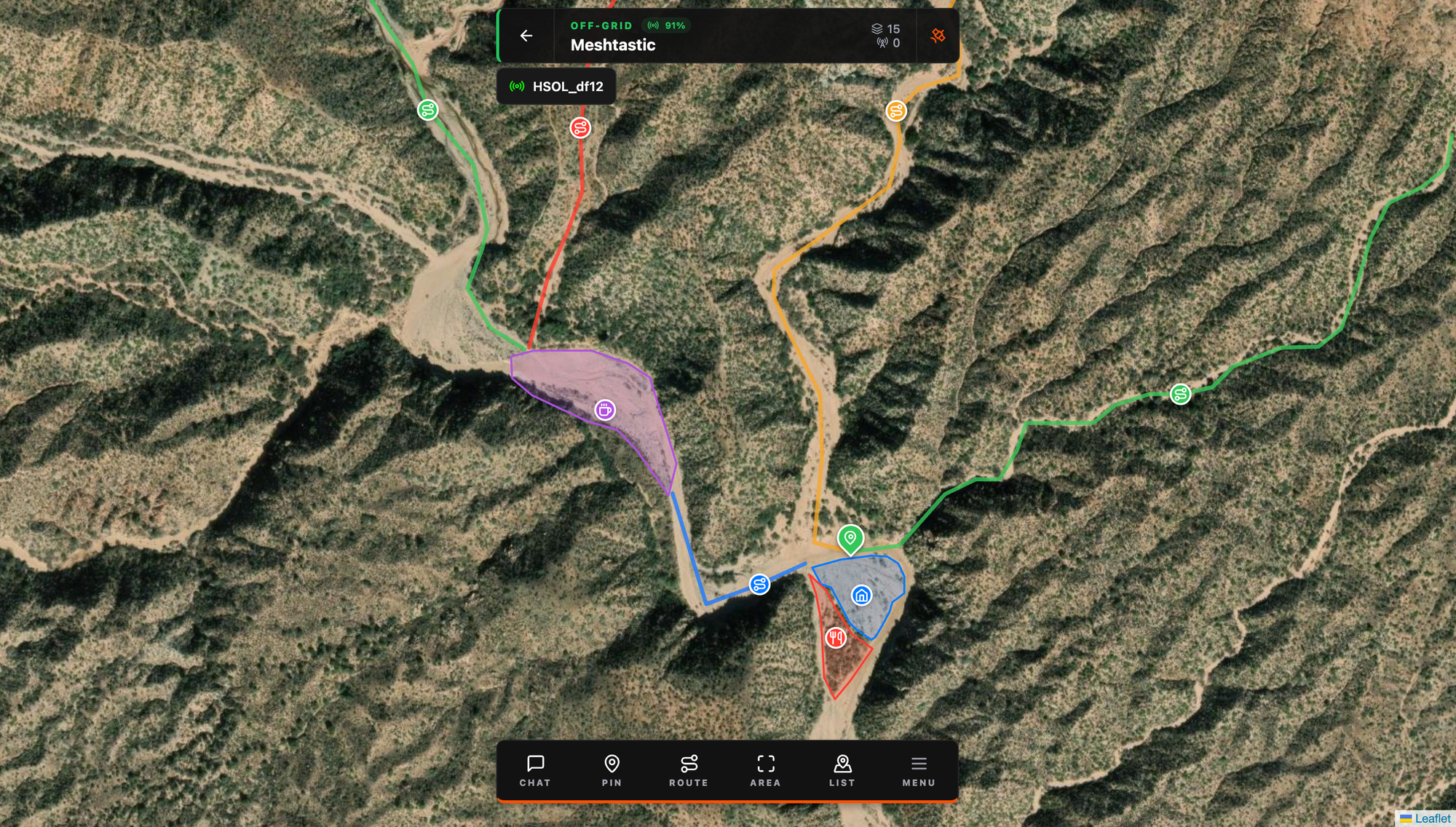 The concept: create an off grid group, connect your Meshtastic radio, and anything your group does on the map, pins, routes, zones, chat, gets transmitted over the mesh to everyone in the group. When you have internet, you can use a cloud based group. When you don't, use the off grid group over LoRa. Same app, same interface, same map. Just switch groups to switch the transport layer depending on what's available.