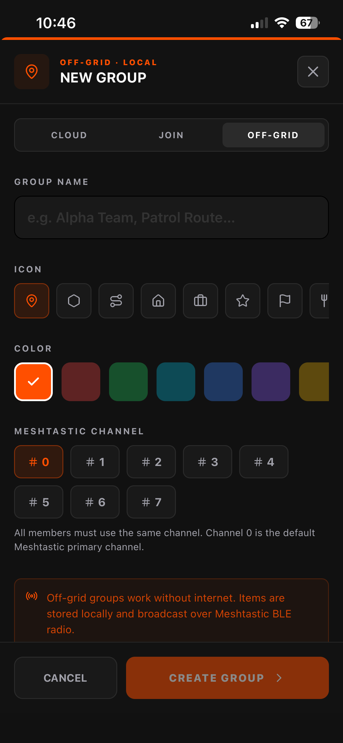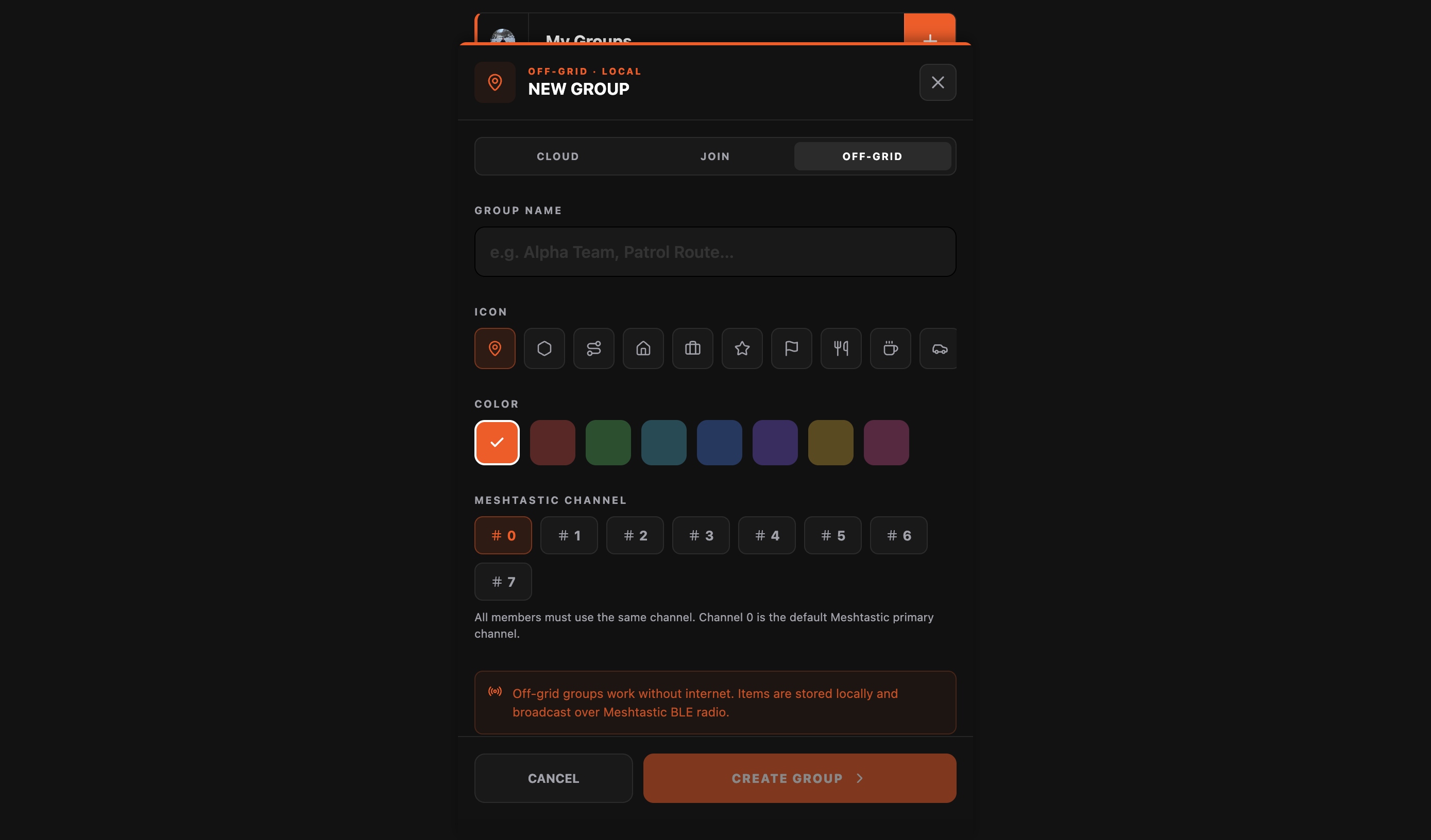 2. Sign up and create a group Hit the + button on the My Groups screen. Choose Off Grid group creation. Give your group a name, color, icon and select a default channel. For now we will keep it 0 (public).