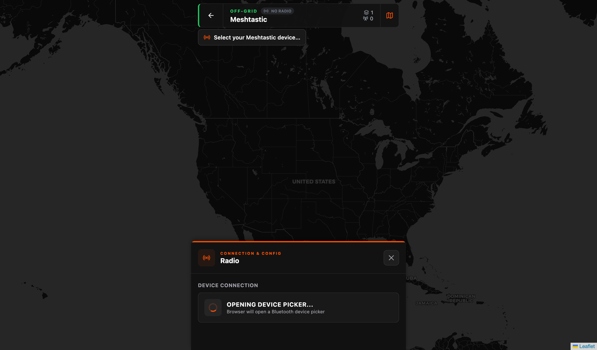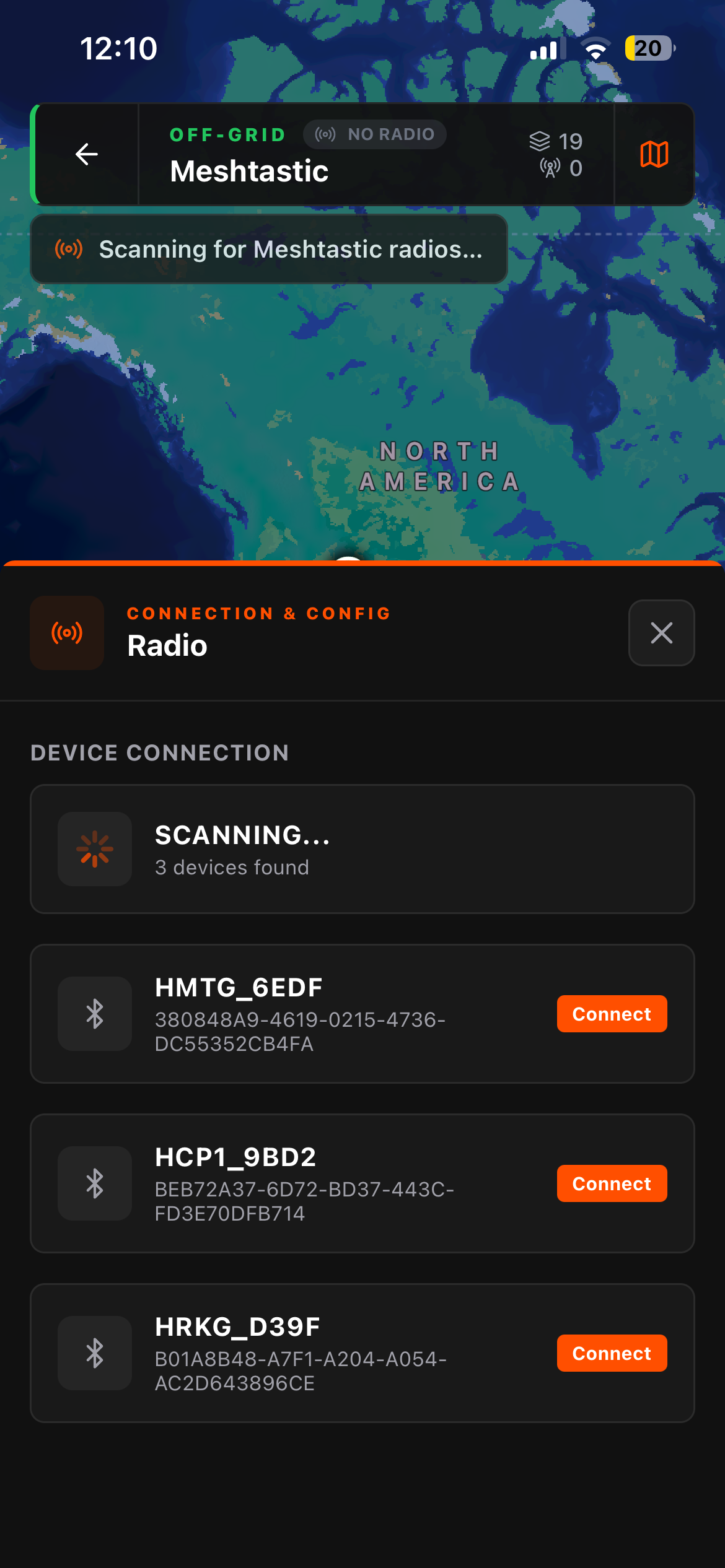 3. Connect your Meshtastic radio Going into the group's Radio settings icon in the top left. Flaresat will scan for nearby Bluetooth devices, select your node. You'll see it show up with its name, node ID, and battery level once connected.