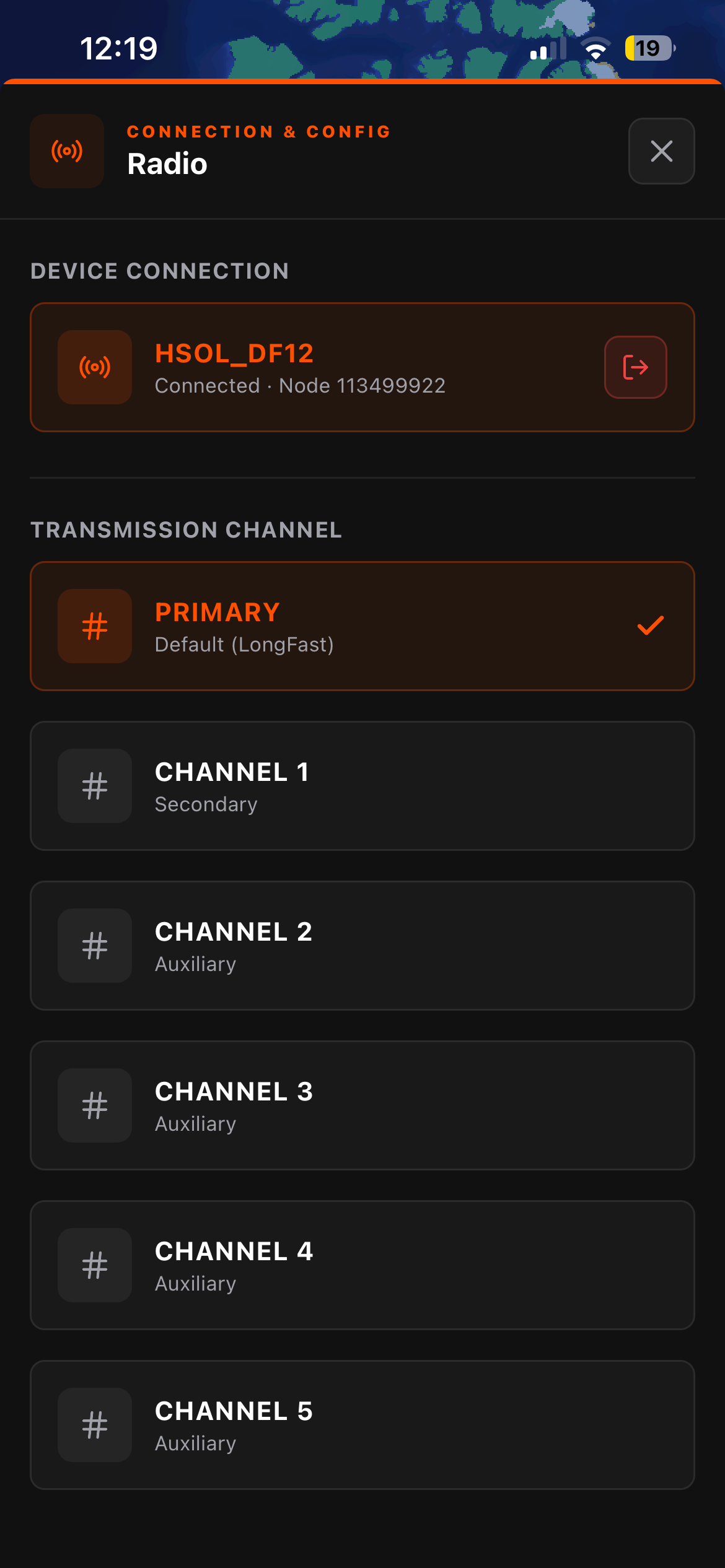 Pairing: You connect your Meshtastic device to Flaresat over Bluetooth, the same way you'd pair it to the official Meshtastic app. In Flaresat's Radio settings you'll see your connected node name. You then select which Meshtastic channel to transmit on.