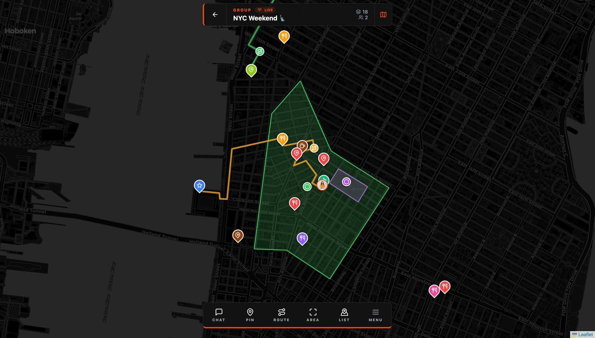 AREA — Draw a polygon to shade a zone. Search grids, camping sections, venue boundaries, exclusion zones. The boundaries show up live for every member.
