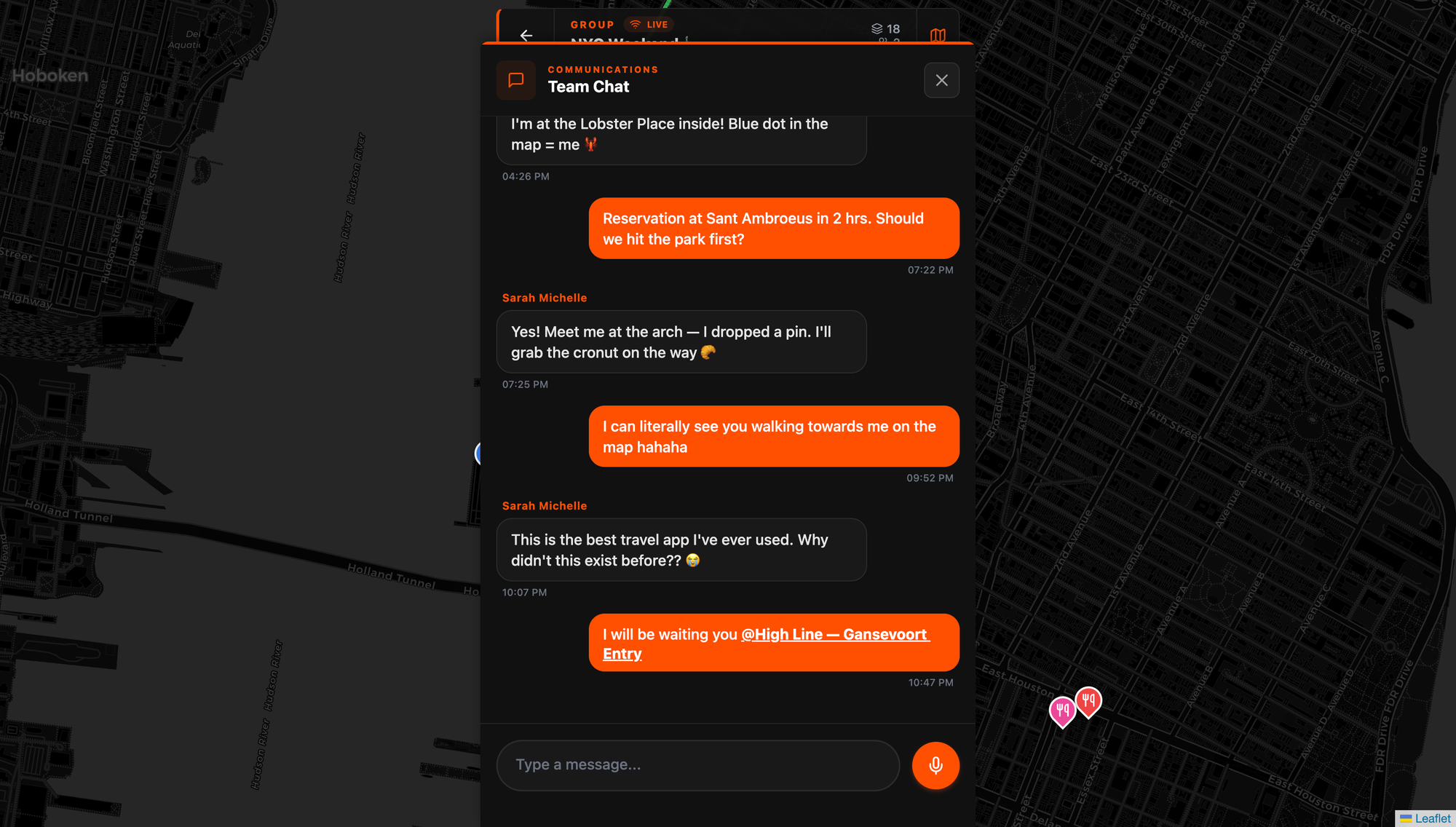 CHAT — Text messaging that's spatially aware. You can reference map objects directly in messages, tapping a linked object flies the map to that location. No switching to another app. No sending screenshots. The conversation and the map are the same view.