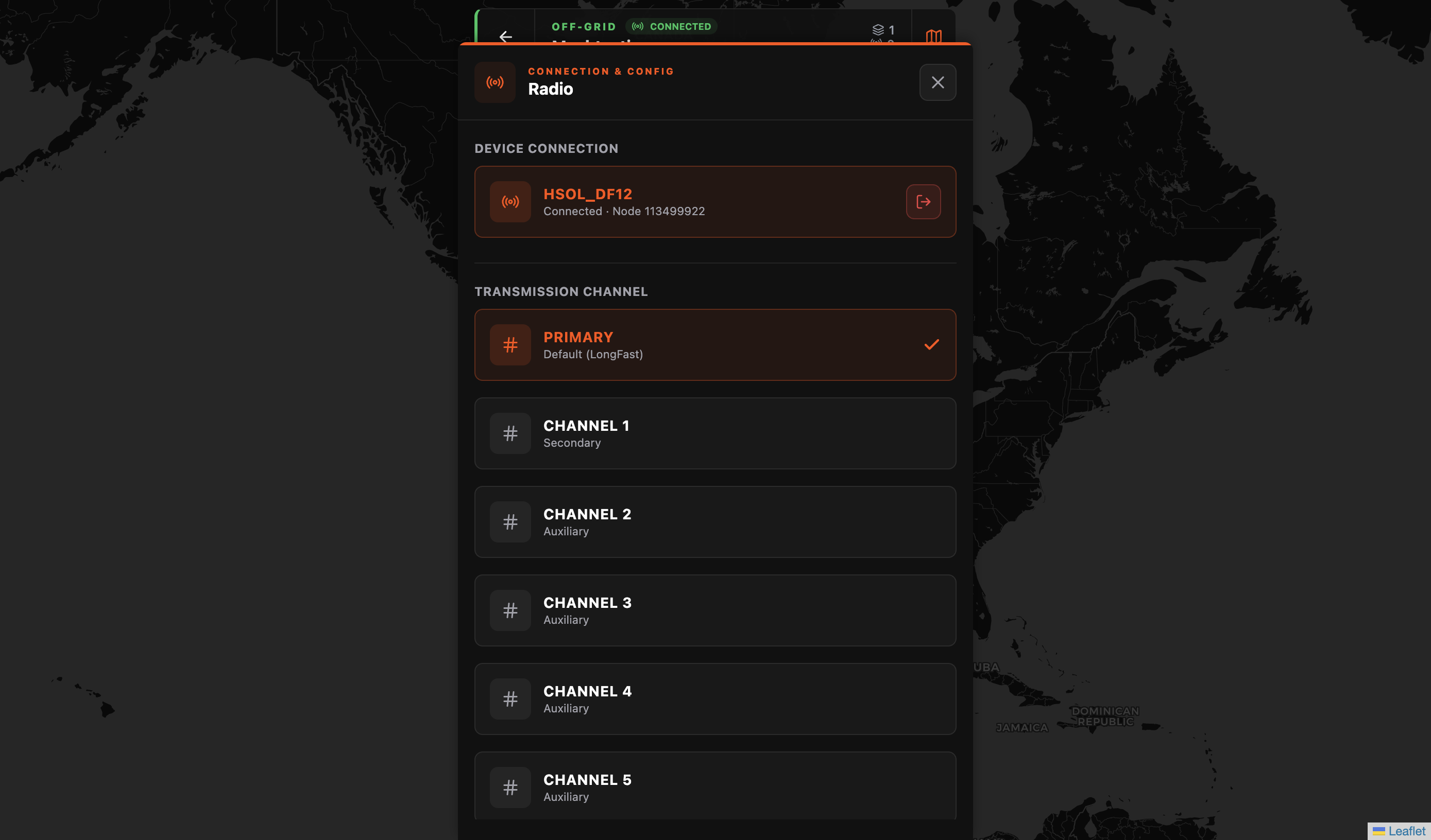 The workflow is: configure your channels and encryption in the Meshtastic app first. Then open Flaresat, select the channel, and start mapping.