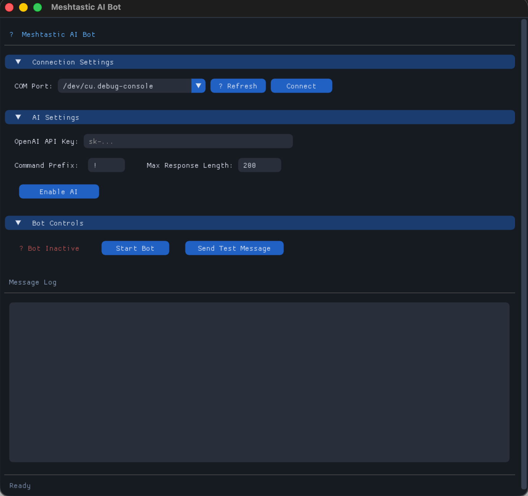 Once you're connected to both Meshtastic and OpenAI, hit Start Bot. The status indicator goes green and the bot starts listening for your command prefix across the mesh.