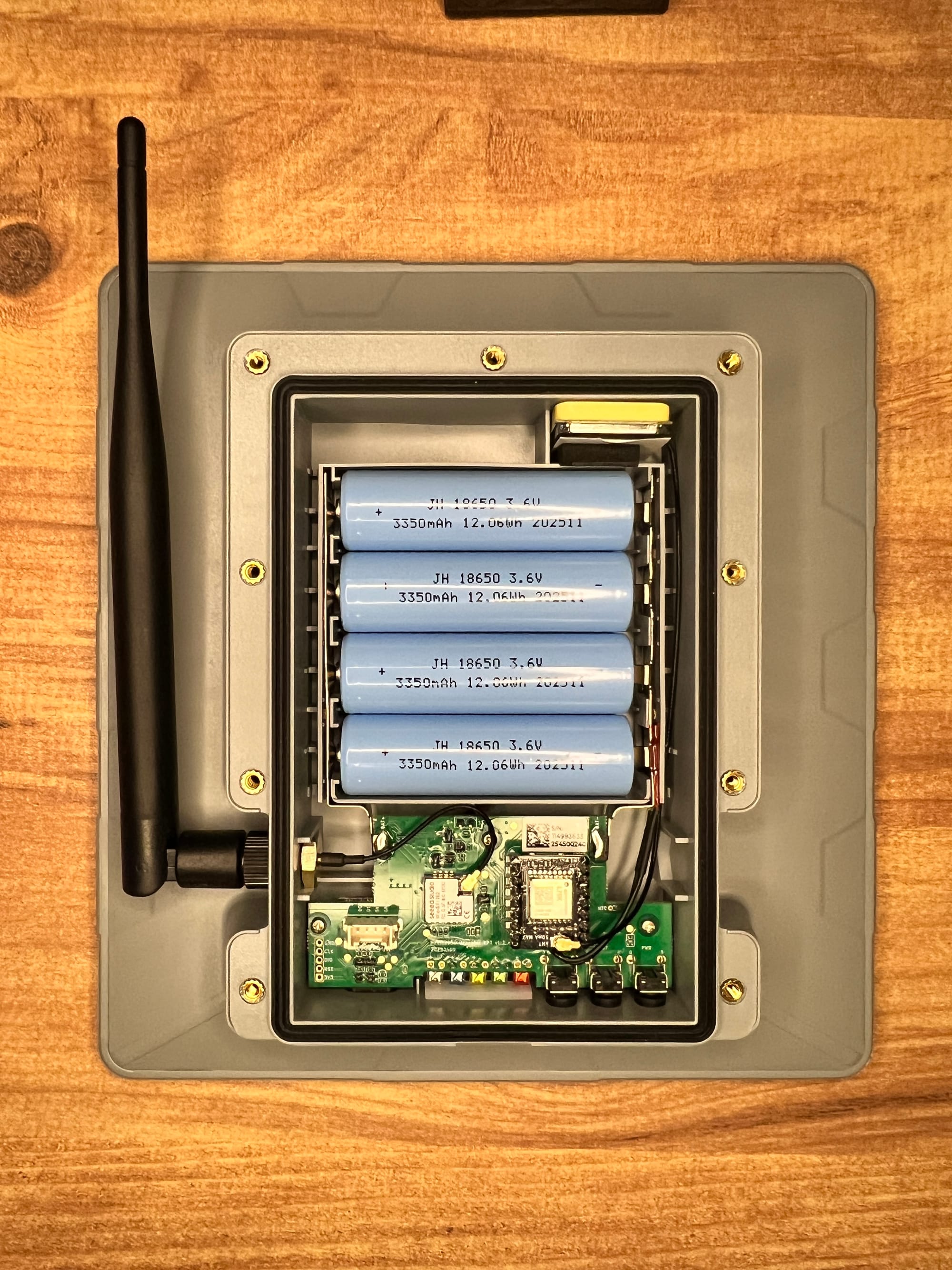 Batteries: 4× JH 18650, 3350mAh each Manufactured November 2025, these are fresh cells. Total raw capacity: 13,400mAh / ~49.6Wh across four cells. That is a serious battery reserve by any Meshtastic standard. Replacement is straightforward, use button-top 18650s.