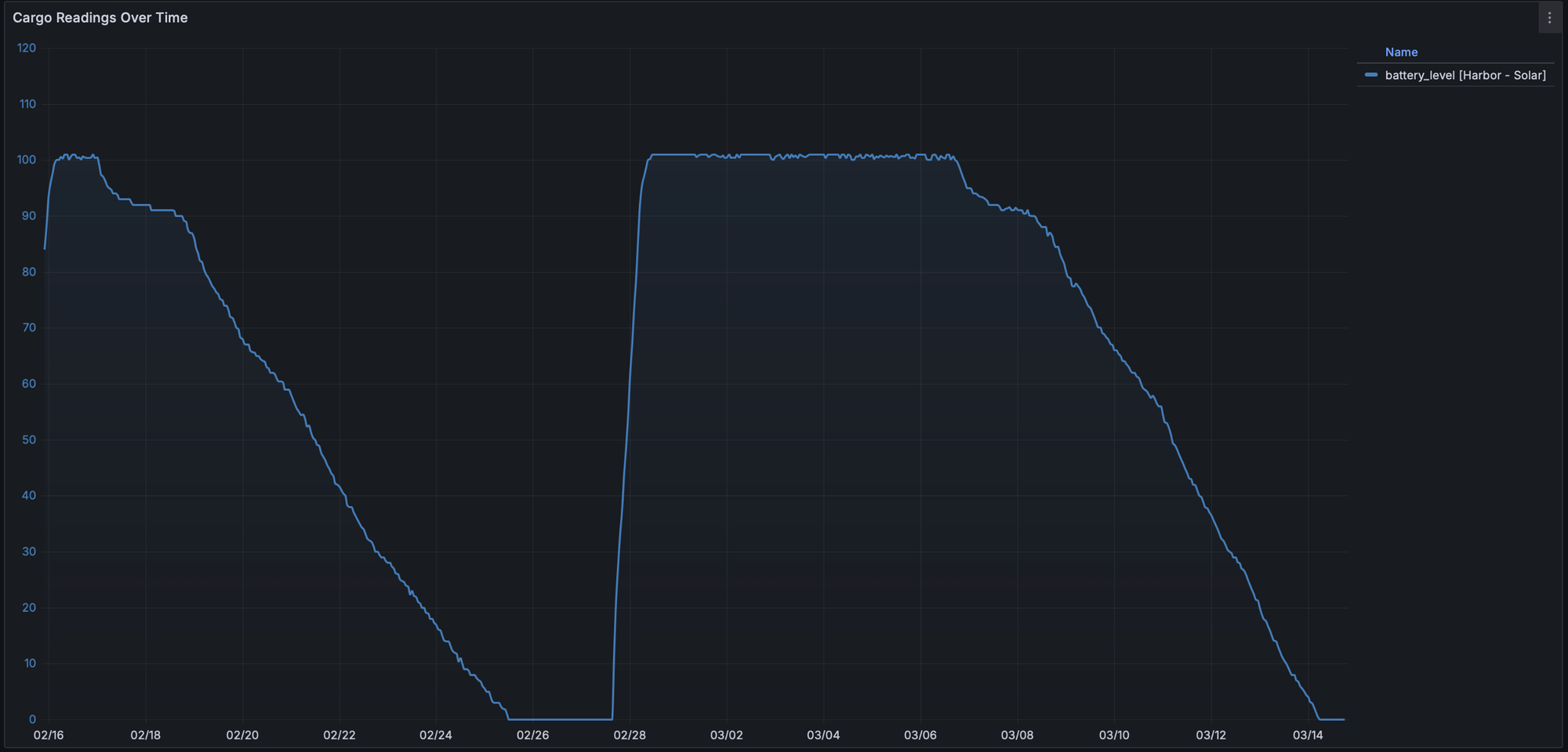We tracked battery behavior over a 27-day period (February 16 – March 14) using Grafana via Harbor Scale. Here's exactly what happened, with no spin:
