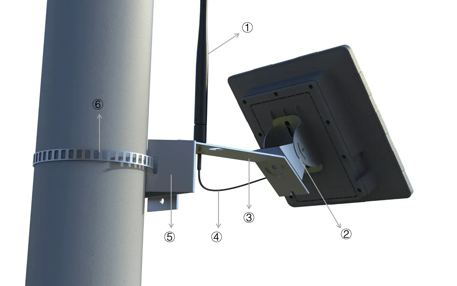 Universal Joint — screws into the two mounting holes on the back of the unit. Swivels up and down for tilt adjustment after the bracket is already fixed to the pole. This matters more than it sounds: you mount the bracket once, then fine-tune your solar panel angle separately. No repositioning the whole assembly.